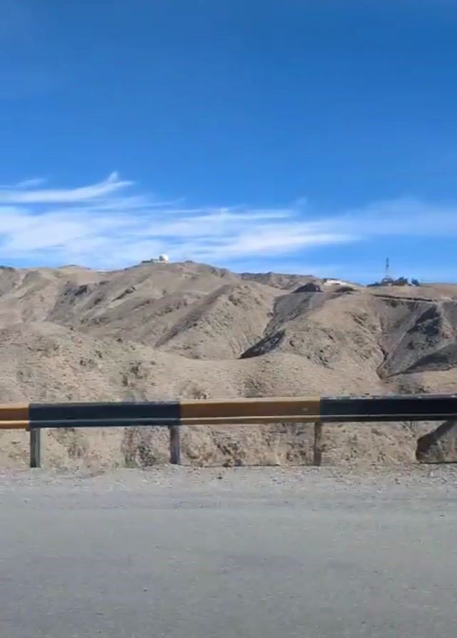 view from a car driving along a road. On the right, there is a metal guardrail, colored black and yellow, separating the road from a mountainous landscape. The mountains are arid and barren, with a light brown color. The sky above is a clear blue, with scattered wispy white clouds. The road is asphalt.