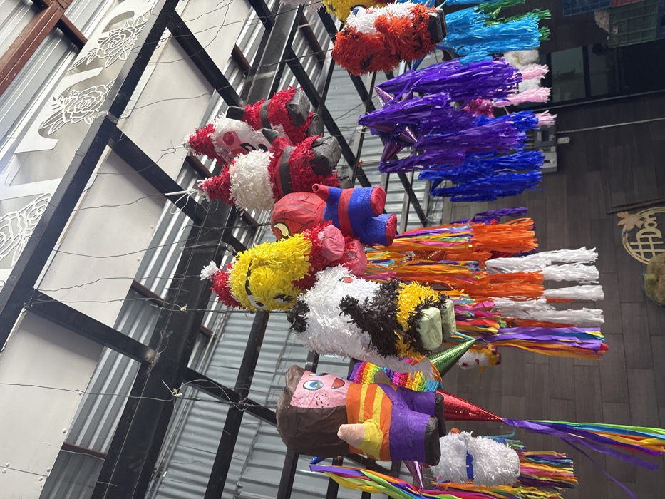 - "A vibrant collection of piñatas, featuring characters like Santa, Spider-Man, and other whimsical designs, hangs suspended from a metal structure" by FM-jgPhH3, licensed under CC BY 4.0