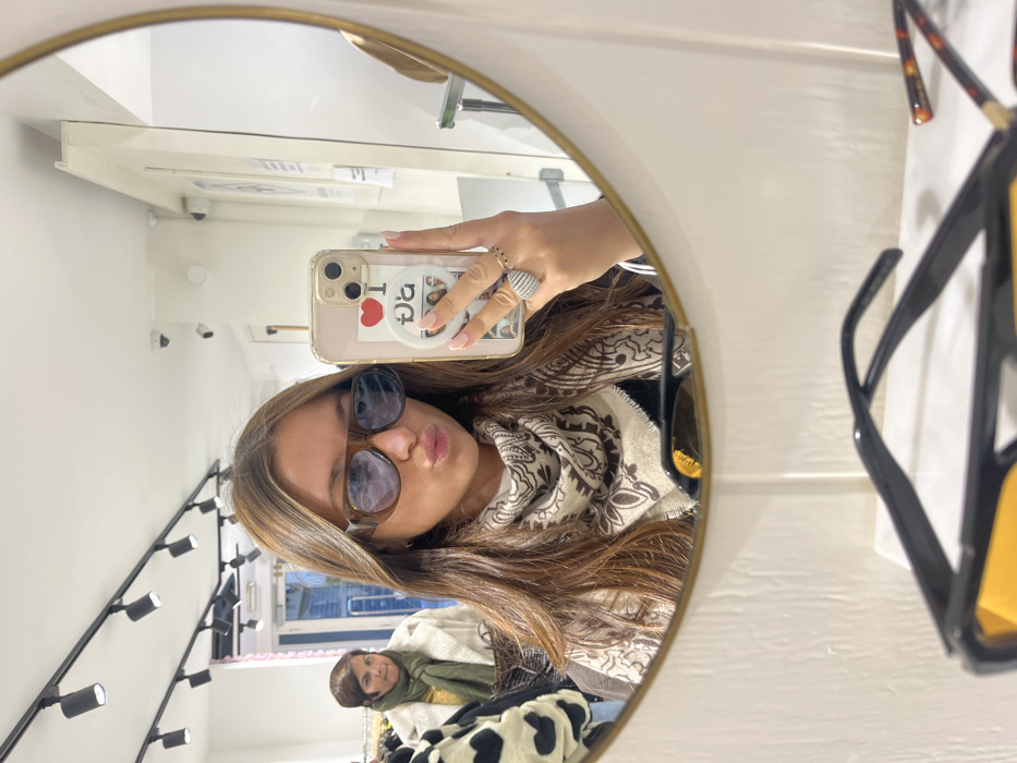 A young adult female is depicted taking a mirror selfie inside a retail store in Avignon, France. She has long brown hair, wears brown-tinted aviator-style sunglasses, and a cream-colored scarf with a brown paisley pattern. Her lips are pursed. She holds a light-colored smartphone with her right hand, which features a pop socket and a sticker displaying a red heart and the letters "da." A prominent, studded ring is visible on her right ring finger. The image is captured in an oval mirror with a gold-toned frame. In the background reflection, a second female with dark hair, wearing a cream coat and an olive-green scarf, is visible to the left. The interior environment consists of white walls, a ceiling with black track lighting fixtures, and clothing racks suggesting a fashion or accessories boutique. Two pairs of sunglasses, one with yellow lenses, are visible on a white surface in the foreground, positioned below the mirror's reflection.
