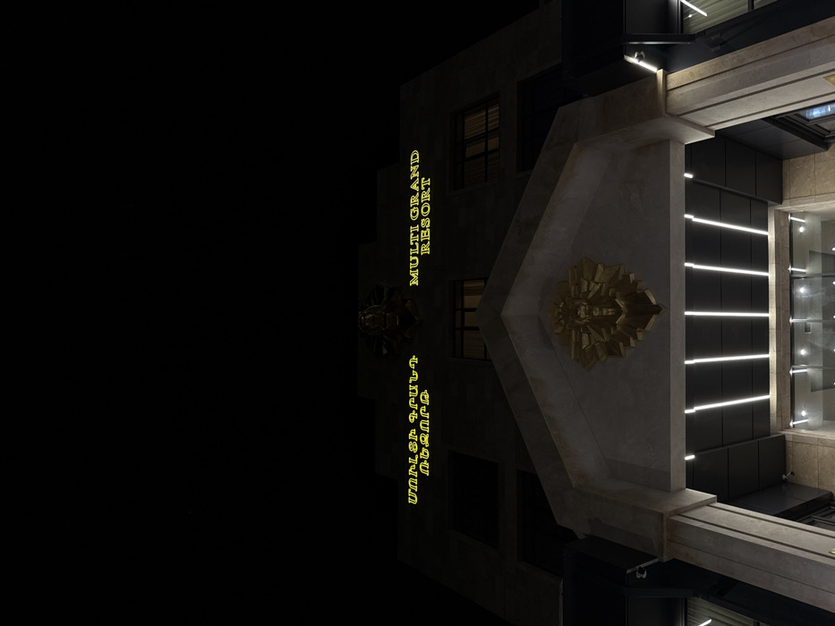 An angular architectural exterior is illuminated with horizontal light bars along the right side. A gold geometric emblem is centered on a light gray section of the facade. To the left, gold text reads "MULTI GRAND RESORT" vertically, followed by additional text in Armenian script. The building's windows are dark, contrasting with the illuminated features. A large, unlit black space fills the left of the image, highlighting the building's facade on the right.