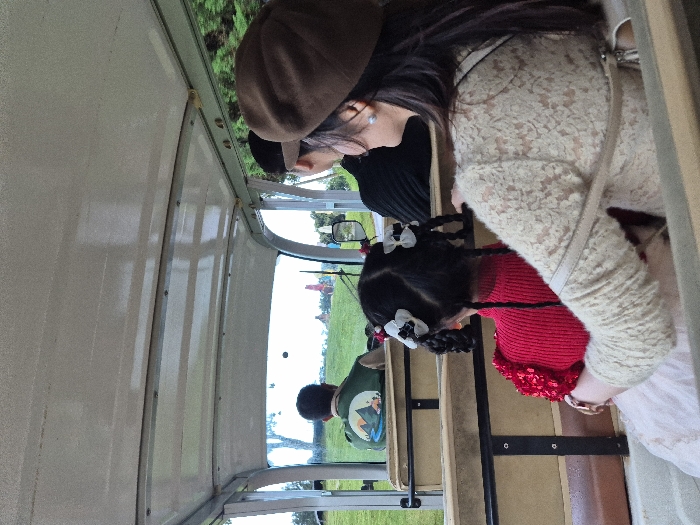 The image depicts the interior of an open-sided passenger vehicle, likely a golf cart or shuttle, transporting multiple individuals through an outdoor, grassy environment in Thôn 5, Vietnam. In the foreground, an adult female is seated on the right, partially facing away from the camera. She wears a cream-colored, long-sleeved lace top, a brown beret, and a pearl earring. Her right arm is extended forward, resting gently around the left shoulder of a young child seated directly in front of her. The child, viewed from behind, wears a bright red long-sleeved top with textured detailing on the shoulders and a light-colored skirt. Her dark hair is styled in two braids adorned with white and black bow clips. Further forward in the vehicle, an adult male, presumably the driver or a front passenger, is seen from behind, wearing a dark green jacket with a light-colored mountain and campfire graphic on the back. Another individual, partially obscured and wearing dark clothing, is seated behind this male. Through the vehicle's front and side openings, a verdant landscape of green grass and trees is visible. In the distant background, beyond a grassy slope, a distinct red-orange structure stands under an overcast sky. The vehicle's interior features a white ceiling and light-colored padded bench seats with dark support railings.