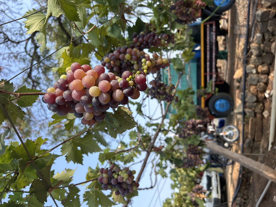 This image depicts a grape vineyard in Chinnalapatti, India, under a clear blue sky. Numerous bunches of grapes, exhibiting varying stages of ripeness with colors ranging from deep red and purple to orange and yellow-green, hang from green leafy vines in the foreground and midground. The vines are supported by an overhead trellising system. In the background, a dirt or gravel path is visible. To the left, a light-colored car is partially obscured, and a motorcycle is positioned centrally. On the right, a larger vehicle, possibly a truck or tractor with a trailer, features blue wheels and a blue/teal body with yellow trim. A low stone wall or foundation runs across the lower portion of the foreground. No individuals are clearly discernible.