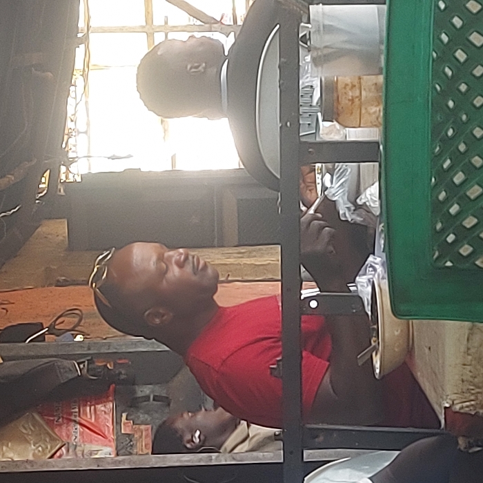 An indoor or semi-sheltered eating establishment, presumed to be in Kassa, Nigeria, is depicted with three individuals present