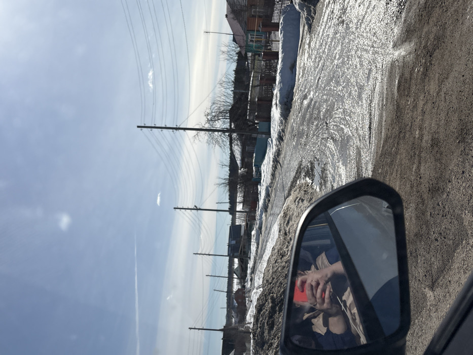 The image depicts a street scene in Кукуштан, Russia. The viewpoint is from inside a vehicle, with a portion of the left side mirror in the lower-left foreground. The mirror reflects a person's hands holding a red smartphone, a ring on a finger, and part of an arm in a beige jacket. The unpaved road ahead is wet, muddy, and marked with tire tracks and reflective patches of slush or ice, indicative of melting snow. Substantial banks of dirty, melting snow line the sides of the road. Various single-story houses, some featuring fences (including a light blue fence on the right), are visible along both sides of the street. Multiple wooden utility poles carrying numerous overhead wires run along the right side of the road. Bare deciduous trees are interspersed among the buildings. In the background, a body of water is visible beyond the structures, with a dark line of forest in the far distance. The sky is bright blue with faint scattered clouds and a distinct contrail in the upper left.