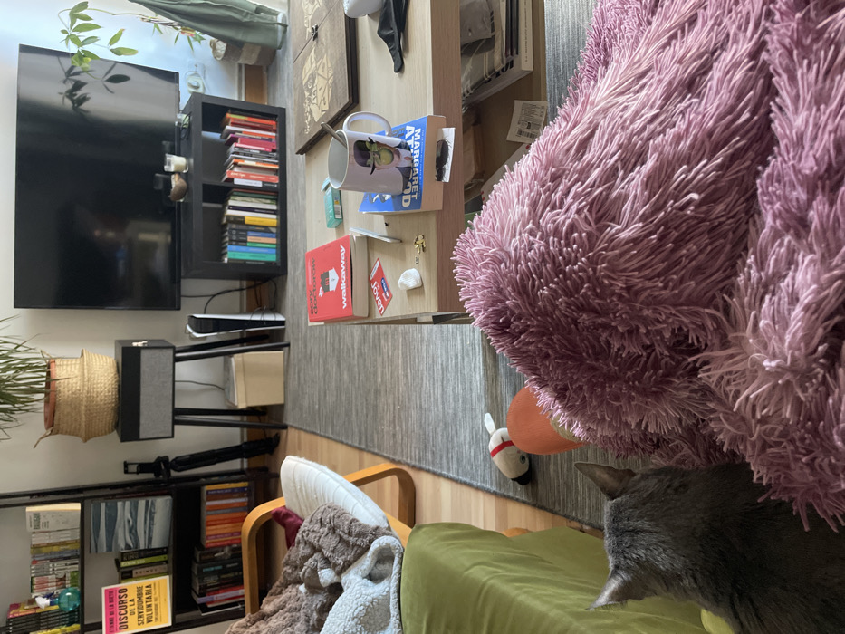 This is an indoor scene within a residential living room in Madrid, Spain, observed from a low perspective. In the immediate foreground, a gray domestic cat is seated with its back to the viewer, facing towards the center of the room. To the right of the cat, a person's lower body is obscured by a large, shaggy, purplish-pink blanket; an orange slipper is partially visible beneath the blanket. In the midground, a light-colored wooden coffee table is centrally positioned. On its surface, a red-covered book titled "Walkaway" by Cory Doctorow lies next to a white ceramic mug depicting a surrealist image of an apple obscuring a face, similar to Magritte's "The Son of Man," with a spoon inserted. A book with "Margaret Atwood" visible on its spine is partially beneath the mug. Other items on the table include a green cigarette pack, a small white rock-like object, a red card labeled "JOVEN," and scattered small metallic components. To the right of these items, a rectangular wooden box with intricate etched patterns rests on the table. A small white and orange plush toy is visible on the striped gray rug in front of the coffee table. The background reveals various furniture and decor. To the left, a tall, black multi-shelf bookcase is filled with numerous books, including "DISCURSO DE LA SERVIDUMBRE VOLUNTARIA." A light blue spray bottle is on an upper shelf. Adjacent to the bookcase, a light-framed armchair with white upholstery is draped with a patterned brown blanket and a lighter, fluffy blanket. In the center-right background, a large black television screen is positioned on a low black entertainment unit. This unit contains shelves filled with books, a small plant, and a candle holder. A white PlayStation 5 console stands vertically to the left of the entertainment unit. A tall, dark-legged side table, topped with a woven basket holding a green plant, is located further to the left, behind the PS5. The floor transitions from a striped gray rug to a light wooden floor. The walls are light-colored, and several houseplants are dispersed throughout the room, indicating a lived-in environment.