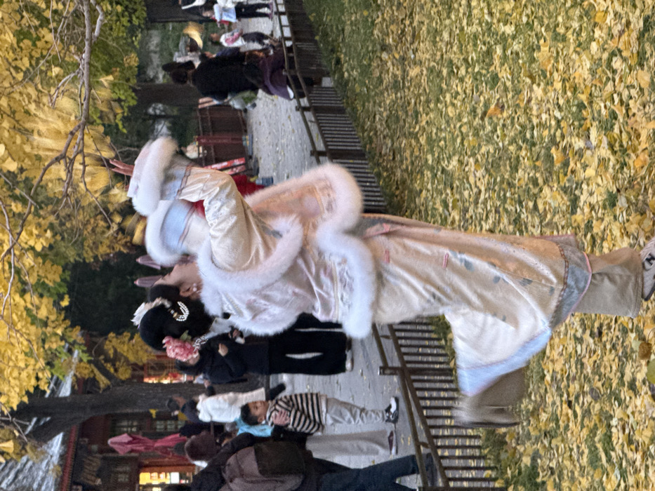 The image displays an outdoor autumnal scene within Xicheng District, China. A female individual in mid-action is captured centrally, appearing to jump with her left leg bent and elevated, and both arms raised upwards with open hands. She is attired in a light-colored, possibly pale gold, long traditional-style coat or robe featuring white fur trim on the collar, cuffs, and hem, accented with blue and pink embroidery. Her hair is styled in a dark traditional bun adorned with a pink flower and a decorative, possibly jeweled, hairpiece. Modern athletic footwear is visible on her feet. The ground beneath her is covered with a thick layer of fallen yellow Ginkgo leaves on a grassy patch, bordered by a dark metal fence. Beyond the fence, a paved area contains several blurred figures, including a young boy in a striped shirt observing the main subject. In the background, trees exhibit dense yellow Ginkgo foliage, and traditional-style buildings with illuminated windows are visible. Further to the right, beyond the fence, additional blurred human figures, including children, are present. The ambient lighting suggests late afternoon or early evening.