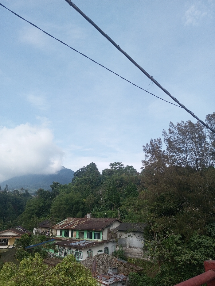 This image presents an elevated daytime view of a mountainous, densely vegetated landscape, identified as Thanthirimale, Sri Lanka. The upper third of the frame shows a light blue sky with scattered white cumulus clouds. Two dark, taut lines, consistent with utility wires, extend diagonally across the sky. In the background, dark green, tree-covered mountains rise, with their upper sections partially obscured by thick white clouds. The midground contains several residential buildings embedded within abundant green trees and shrubs. A prominent two-story structure features a rusted green corrugated metal roof and white-painted walls with light green window frames. Below it, another building with a patterned tile roof and multiple small-paned windows is visible. Other structures, including one with a gray corrugated metal roof, are partially obscured by foliage. The immediate foreground on the lower right features a horizontal reddish-brown structural element, possibly a railing, and dense green vegetation. No individuals are discernible.