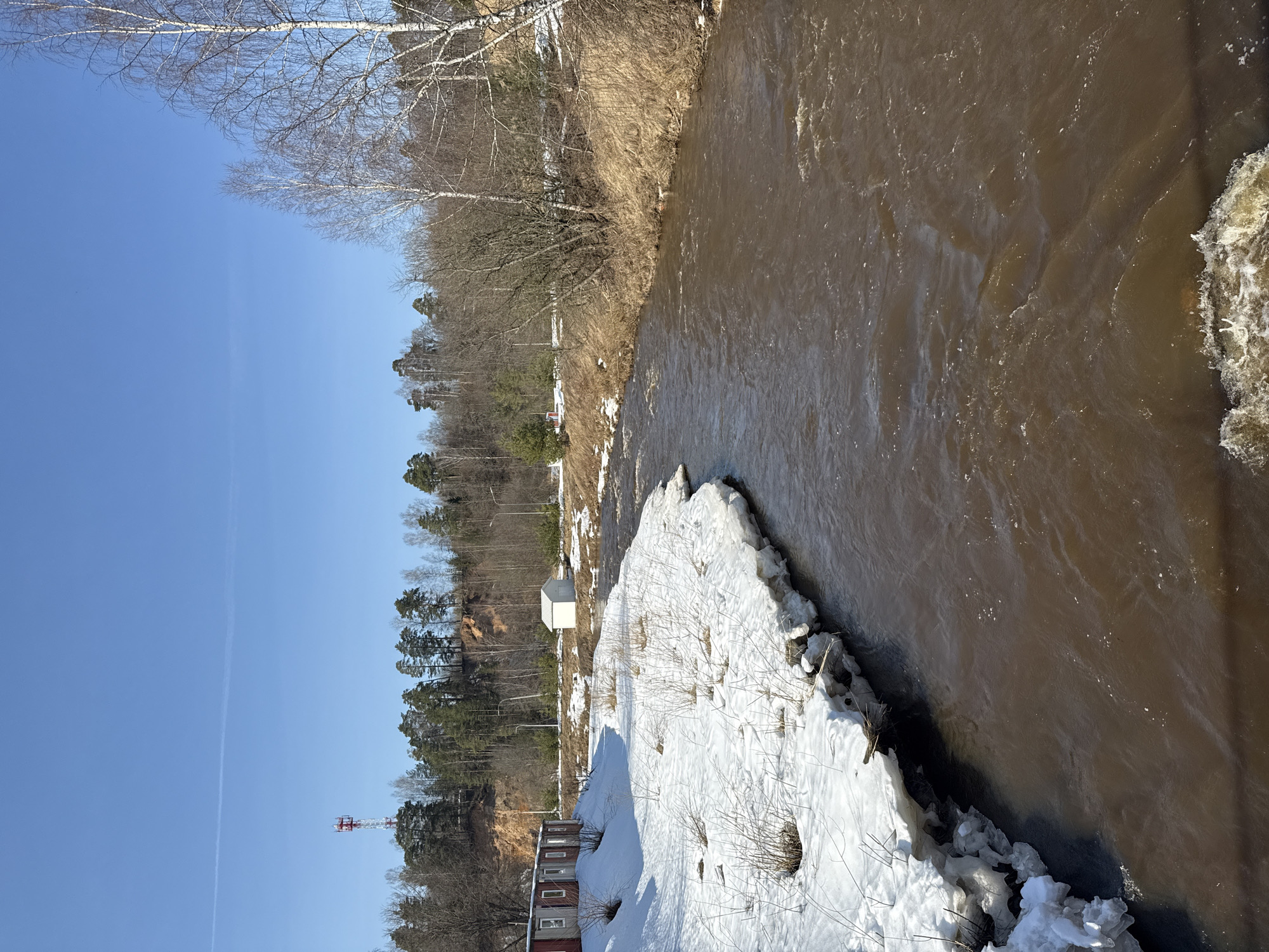 Oleshkovo, Russia: The image presents a landscape featuring a turbid, brown-colored river flowing from the foreground towards the background under a clear, light blue sky containing one visible contrail. The left riverbank, from the lower left to the mid-ground, is predominantly covered in a thick, uneven layer of melting snow and ice, with patches of dry, light-colored vegetation emerging. Adjacent to this snow-covered bank are four red-sided modular structures, each with a single window, arranged in a row. The right riverbank consists of dry, light brown grass and sparse, bare deciduous trees. Further inland on the right bank, a small, white, single-story shed is visible. Both banks are backed by rising terrain, densely covered with a mix of bare deciduous trees and evergreen conifers. In the distance, atop the treeline on the left, a red and white lattice communication tower stands prominently. No individuals or discernible activities are present in the scene.