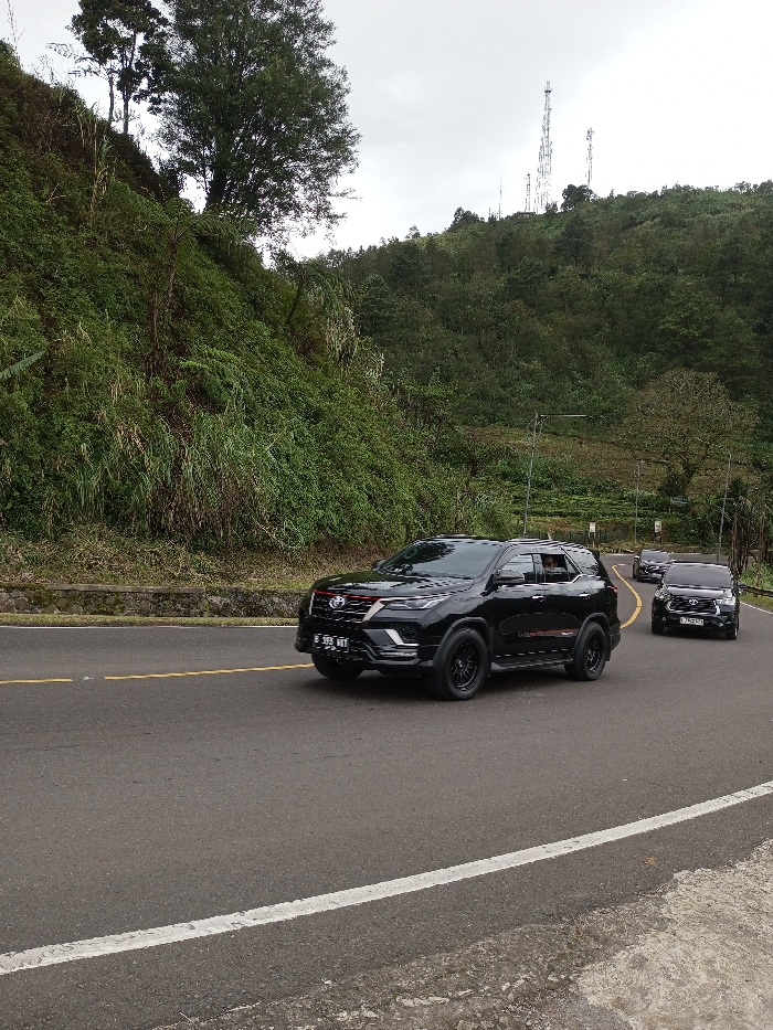The scene depicts a winding paved road in a mountainous, heavily vegetated area, identified as being in Adhanur, India. Three black SUVs are in motion, proceeding in a convoy formation along the road, which features a dashed yellow center line and a solid white line marking the right shoulder. The lead vehicle is a black Toyota Fortuner, customized with black multi-spoke wheels, red accents on the front grille, tinted windows, and a red and black decal on the lower side doors. Its front license plate displays "B 989 WMT". A person is visible in the front passenger seat. Following the Fortuner is a black Toyota Innova, with a partially visible license plate beginning "B 2420...". A third black SUV, also resembling a Toyota Innova, trails behind the second vehicle. To the left of the road, a steep hillside rises sharply, densely covered with various green foliage, trees, and tall grasses. A low concrete barrier with a stone facade separates the road from this slope. To the right of the road, the terrain slopes gently, also covered in green vegetation, including trees and what appears to be a cultivated field or plantation further in the distance. Several tall metal lattice towers, likely for telecommunications or power transmission, are visible on a distant, higher ridge against an overcast, light gray sky. Utility poles line the road further down the visible stretch. No pedestrians are visible.