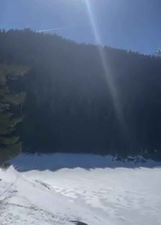 bright, sunny winter scene. A frozen lake covered in snow is the main focus, with dark green coniferous trees densely covering the hillside behind it. A snow-covered mountain peak is visible in the distance. The sun is shining brightly, creating a strong lens flare. The camera pans slowly across the landscape.