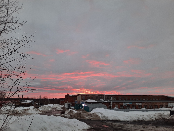 The image depicts an urban-industrial scene in the city of Krasnogorskoye, Russia, under a cloudy sky at either sunrise or sunset. The sky is predominantly overcast gray, with distinct horizontal streaks and patches of bright pink and orange light concentrated near the horizon, especially towards the right, indicating the low position of the sun. The foreground features a terrain covered with significant accumulations of dirty, melting snow, forming mounds and exposing dark, wet ground or asphalt patches. Bare, dark, deciduous tree branches are visible on the far left, extending from the lower corner upwards. In the midground, a long, two-story brick building with multiple dark windows dominates the right half of the frame. Several signs are affixed to its facade, displaying Cyrillic text, including "ШИНОМОНТАЖ" (Tire Fitting) and "ПИВНОЙ БАР" (Beer Bar). Smaller, low-rise structures, some appearing to be corrugated metal, are situated in front of the brick building. In the background to the left, additional industrial structures and what appear to be smokestacks are silhouetted against the horizon. No people are visible.