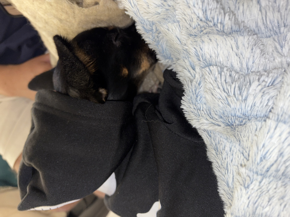 A small, short-haired dog, predominantly black with tan markings around its snout and ears, is depicted resting or sleeping in an indoor setting. The dog is wearing a black hooded garment, which appears to be a hoodie or costume, with a white, indistinct design on its left side. The hood is pulled over the dog's head, obscuring its eyes but leaving part of its snout and one erect ear visible. The dog is nestled on a light blue, plush, fuzzy blanket or textile, which occupies the lower half of the frame. Behind the dog's head, to the right, a cream or light beige colored soft object is visible, possibly another blanket or cushion. In the upper background, out of focus, a person's leg or arm with light skin tone and dark clothing can be partially observed, suggesting the dog is being held or resting adjacent to an individual. The scene is located in Tel Aviv, Israel.