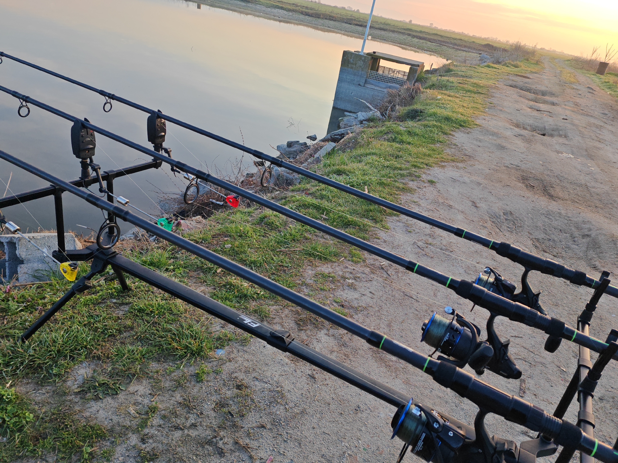The image depicts a fishing scene at a tranquil body of water in the city of Войводино, Bulgaria, under warm, soft lighting indicative of sunrise or sunset. Four black fishing rods are angled from the lower-left foreground towards the upper-right, supported by a black metal rod pod resting on a bank of sparse green grass and bare earth. Each rod is equipped with a black fishing reel featuring blue-green line, and a black electronic bite alarm with a colored indicator (red, green, silver, and yellow examples are visible). The calm water, reflecting the sky's light yellow and orange hues, occupies the left portion of the frame. On the far bank of the water, a concrete structure, likely a sluice gate or culvert with a metal grate, is visible, from which a single white pole extends vertically. To the right of this structure, a wide, uneven dirt path runs parallel to the water, leading into the distant background of flat land or fields beneath a sky transitioning from bright yellow-orange near the horizon to pale blue. No individuals are present in the scene.