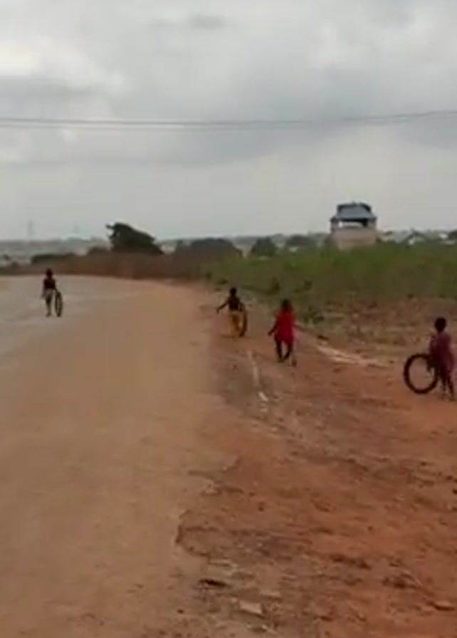 four children, possibly boys, playing on a dirt road in an open area. All the children appear to be holding or manipulating black tires or tire rims. The child farthest from the camera is running down the road away from the camera while holding his tire. The other three children appear to be standing or walking with their tires along the side of the road. The area is rural or suburban, with visible buildings in the distance and utility poles along the side of the road. The sky is overcast with grey clouds.
