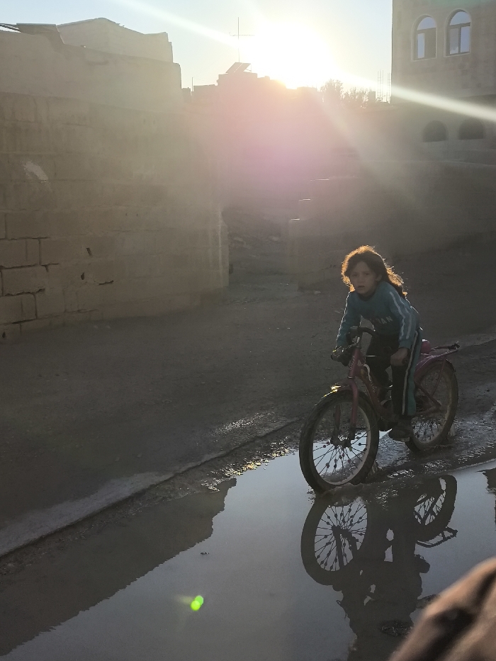 - "An outdoor scene in Jirud, Syria, depicts a child on a bicycle near a large puddle under direct sunlight" by FM-KeD0c2, licensed under CC BY 4.0