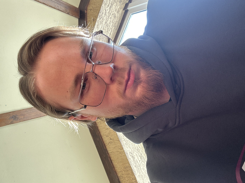 A male subject is depicted in a close-up, head-and-shoulders photograph, positioned indoors. He possesses light-colored hair, parted centrally, and a reddish-blonde goatee and chin beard. He wears silver-framed, rectangular eyeglasses with faintly pink-tinted lenses. His garment is a dark gray hooded sweatshirt. His facial expression is neutral, and his eyes are directed towards the viewer. The background reveals a light-colored ceiling with exposed dark wood beams and a light-toned, textured wall. A window admitting significant ambient light is visible to the subject's right. The image contains no visual identifiers to confirm a specific location within Prokhorovo, Russia.