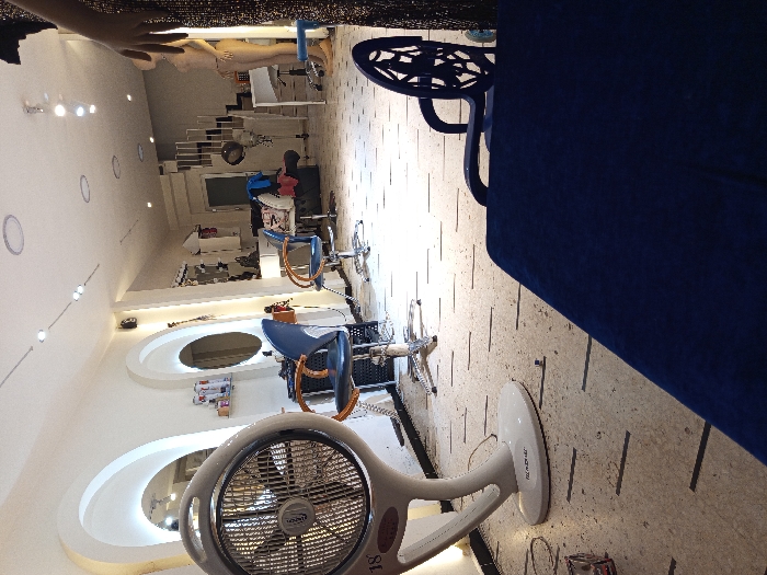 The image displays the interior of a commercial establishment, specifically a beauty salon, located in Rukn ad-Din Municipality, Syria. The scene is static, with no individuals present. In the left foreground, a white pedestal fan, approximately 18 inches in diameter, stands on a light-colored floor with dark, thin horizontal stripes. To the right, a dark blue rectangular object, consistent with a padded bench or table covered in fabric, occupies the lower right quadrant. Behind this object, a dark blue plastic chair with an openwork pattern on its backrest is partially visible. The midground features three adjustable salon chairs with blue upholstered seats, wooden armrests, and chrome bases. Two are closer to the left, while a third is positioned further back on the right. The left wall has two illuminated arched recesses, each containing a circular mirror, with shelves below them holding various bottles and containers. The background reveals a white metal staircase with open risers ascending towards the upper right. To the left of the staircase, a headless, armless mannequin torso and legs are visible next to a white table. A dark, glittery garment or fabric partially obscures the extreme right edge of the frame, covering part of the mannequin. Another smaller fan is situated near the base of the staircase. The interior features white walls and a white ceiling equipped with both recessed circular lighting and linear track lighting fixtures.