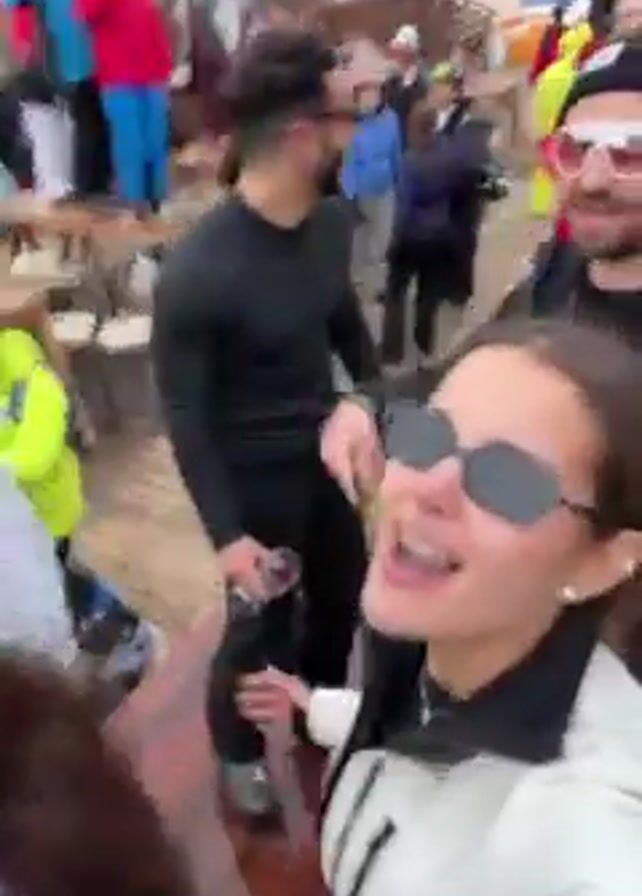 A woman in a white ski jacket and sunglasses records a selfie video on a crowded, wooden deck. A man in black dances in the background, holding a wine glass. Other people are also dancing and milling about. There is a building behind them, partially obscured by the crowd. The weather appears overcast.