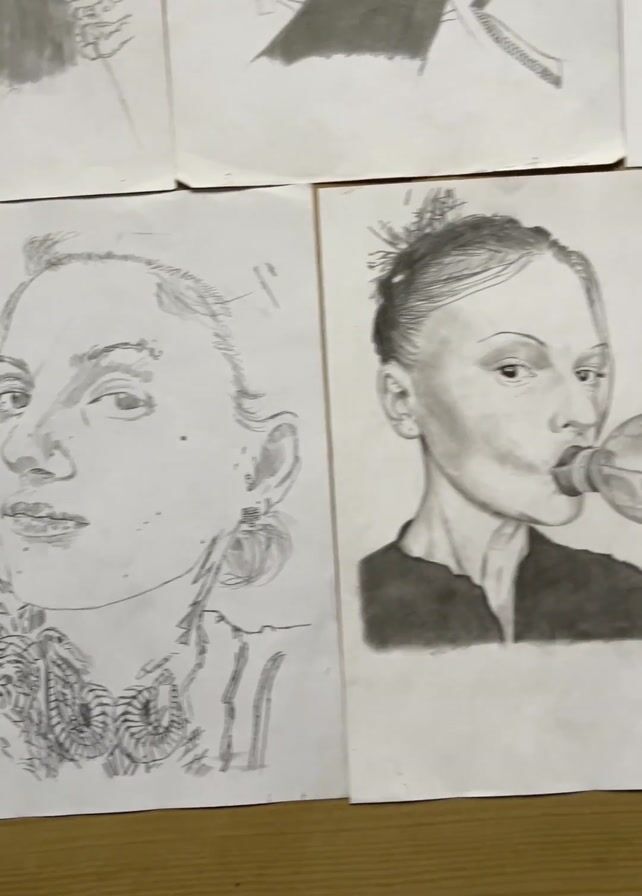 The camera pans across a collection of pencil portraits laid out on a wooden surface