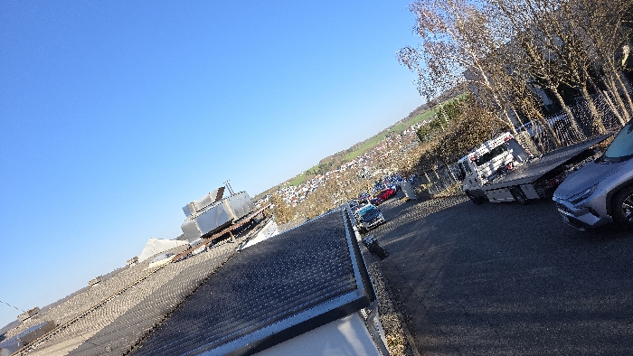 The image displays an elevated view of an outdoor scene in Neuhof, Germany, under a clear blue sky. In the left foreground, a dark, textured surface, possibly a rooftop or an elevated platform, is visible with a light-colored metallic trim along its edge. Below this, an asphalt road or parking area extends diagonally across the mid-ground. Several vehicles are present on the asphalt surface. A light blue or teal passenger car is partially visible on the left side of the road. Behind it, a red passenger car is parked. Further along the road, a silver sport utility vehicle (SUV) is parked, facing right. Directly behind the SUV is a white flatbed tow truck, also facing right, with an indistinct red object secured on its flatbed. To the right of the road and vehicles, a line of deciduous trees with bare branches extends across the mid-ground. Beyond these trees, a series of industrial or commercial buildings with corrugated roofs and visible rooftop ventilation units or tanks are present. Adjacent to these buildings, an area of densely packed, indistinct materials or debris extends towards an open, green field in the background. Scattered residential or commercial structures are discernible in the distant background, indicating a populated area. The scene is illuminated by strong, clear daylight. No individuals are visible.