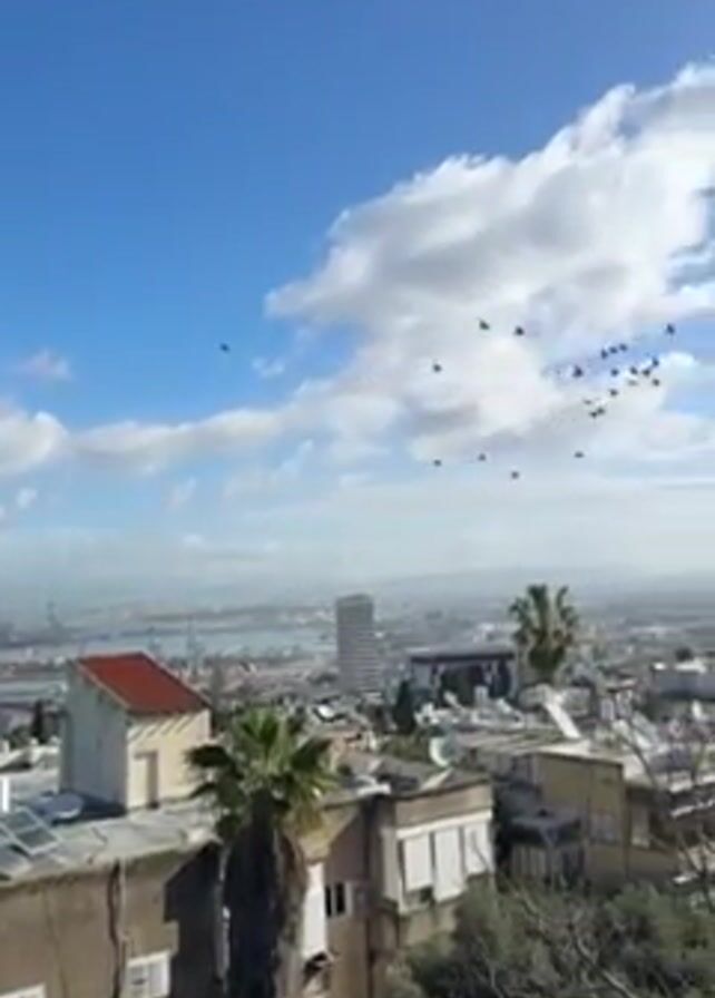 cityscape on a sunny day with fluffy white clouds in a bright blue sky. A flock of birds is flying across the sky. The foreground is a cluster of low buildings, some with flat roofs and solar panels, others with pitched roofs. Trees, including palm trees, are visible between the buildings. In the distance, a city skyline stretches along the horizon, with a bridge and taller buildings visible. The viewpoint is elevated, looking down on the city. The camera pans slightly to reveal more buildings and rooftops.