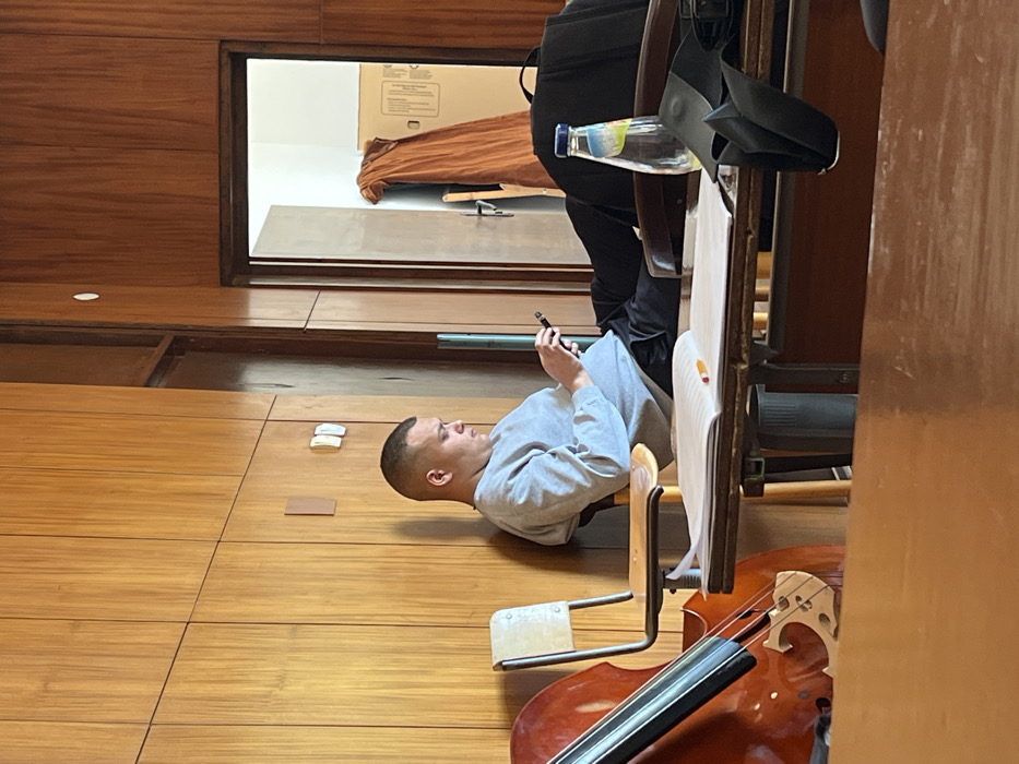 The scene is set indoors, likely within a music classroom or rehearsal room in Kotel, Bulgaria. A light-skinned male individual, with a short, buzz-cut hairstyle, is seated on a wooden and metal chair against a wood-paneled wall. He wears a light grey long-sleeved sweatshirt and dark trousers, with his legs extended forward, resting on an object outside the frame. He is actively engaged with a black smartphone, which he holds in both hands, looking down at the screen. To the left of the individual, a brown wooden cello is positioned upright, with its F-holes and bridge clearly visible. In front of the seated person, a dark wooden desk or table holds an open sheet music book, a yellow pencil, a clear plastic water bottle with a blue cap, and a black strap. Directly behind the desk, a black backpack rests on a chair. To the right, a wooden door stands ajar, revealing a portion of an adjoining room with a white wall, an orange fabric draped over an object, and part of a large white cardboard box. The room's walls are uniformly covered in light brown wooden paneling.