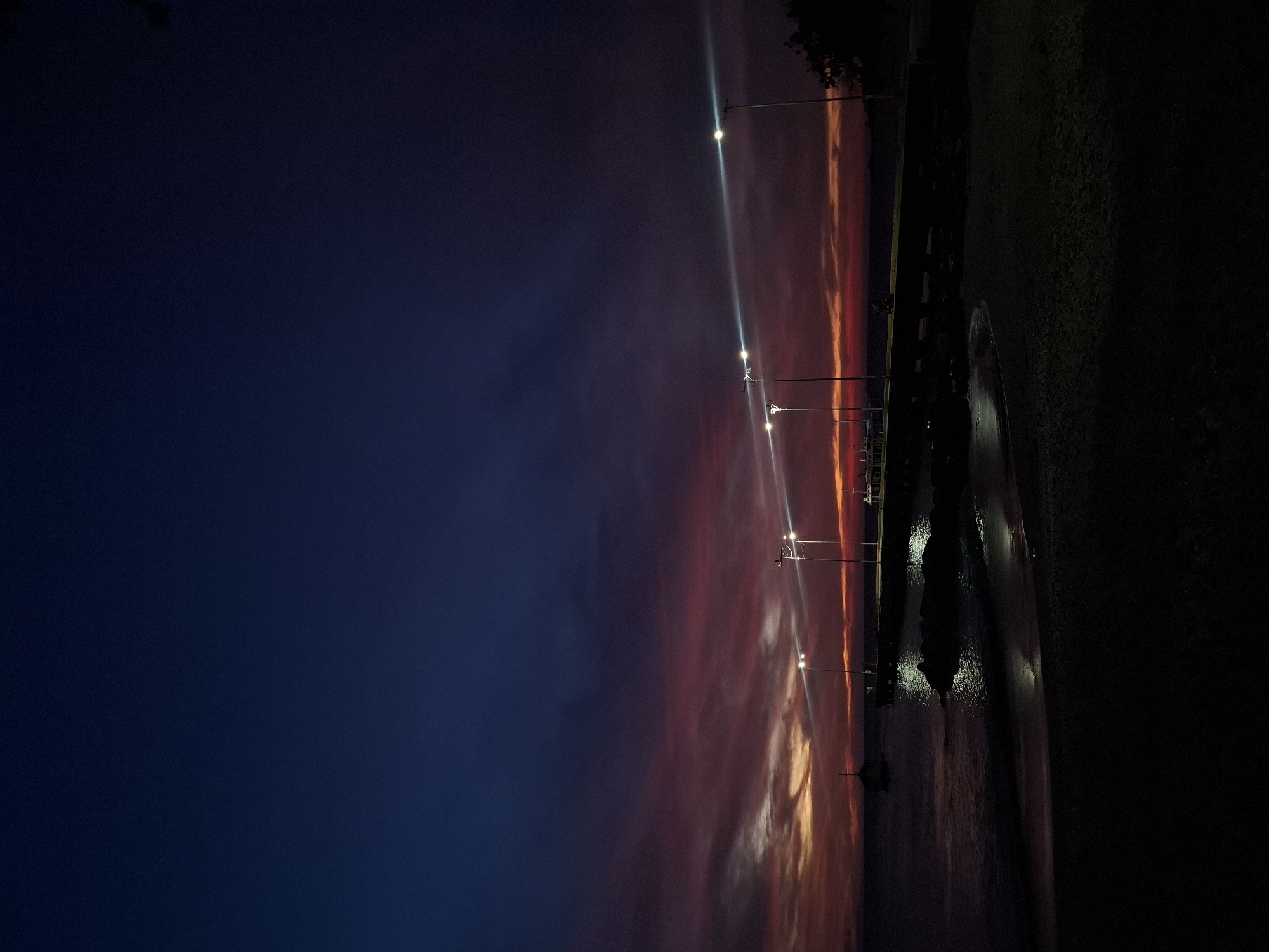 This image depicts a coastal scene at dusk or twilight in Juan Griego, Venezuela. The upper sky is a deep navy blue, transitioning to a vivid horizon displaying a gradient of red, orange, and purple hues with visible cloud formations. The dark ocean surface reflects ambient light and artificial illumination. A dark sandy beach occupies the foreground, leading to the water's edge. A concrete pier extends from the right side of the frame into the water, illuminated by a series of five distinct streetlights emitting bright white light, which creates streaks across the sky. The light from these streetlights reflects on the water near the pier. A small, dark-hulled boat is moored or anchored in the water to the left of the pier. The silhouette of at least one individual is discernible on the pier, positioned near the center-right street light. Dark, undefined vegetation borders the land on the far right.