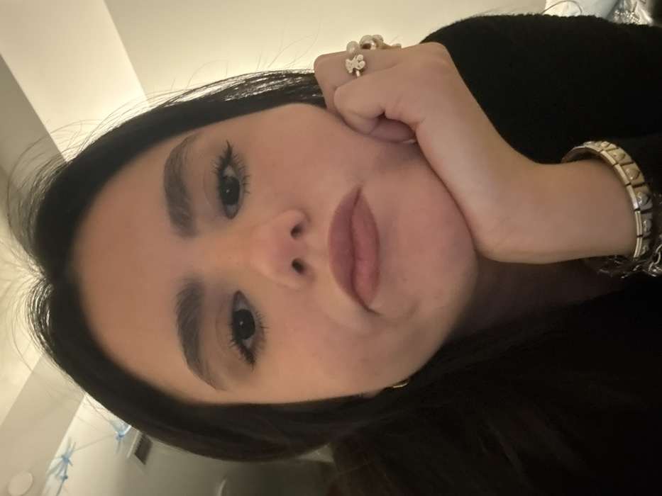 A woman poses with her head tilted, resting her chin on her hand