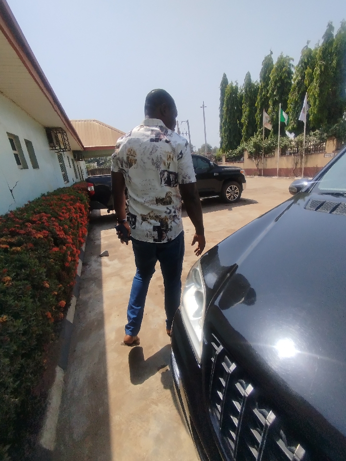 The image depicts an outdoor scene in the city of Nassarawa, Nigeria, under bright daylight with a clear sky. In the foreground, the front-right section of a black vehicle, likely a sedan or SUV, is partially visible, featuring a prominent chrome grille and a clear headlight. An adult male is walking away from the camera, positioned slightly left of center. He has short dark hair and is wearing a short-sleeved, collared shirt with a multi-colored abstract pattern on a light background, blue jeans, and brown flip-flops. He holds a dark-colored smartphone in his left hand. His shadow is cast on the light-colored paved ground. To the left, a light-colored building (possibly white or light blue) with a reddish-brown roof is visible. Rectangular windows and multiple air conditioning units/exhausts are mounted on its side. A dense, low-lying hedge with numerous red-orange flowers runs parallel to the building's base. In the mid-ground, a dark-colored (likely black) pickup truck, possibly a crew cab model with silver wheels, is parked facing away from the camera. Further in the background, a light brown wall is visible, behind which a line of tall, slender green trees stands. Several flags are mounted on poles above the wall, including a green and white flag (consistent with the Nigerian flag) and other lighter-colored flags. A utility pole is also visible in the distance to the right of the trees.