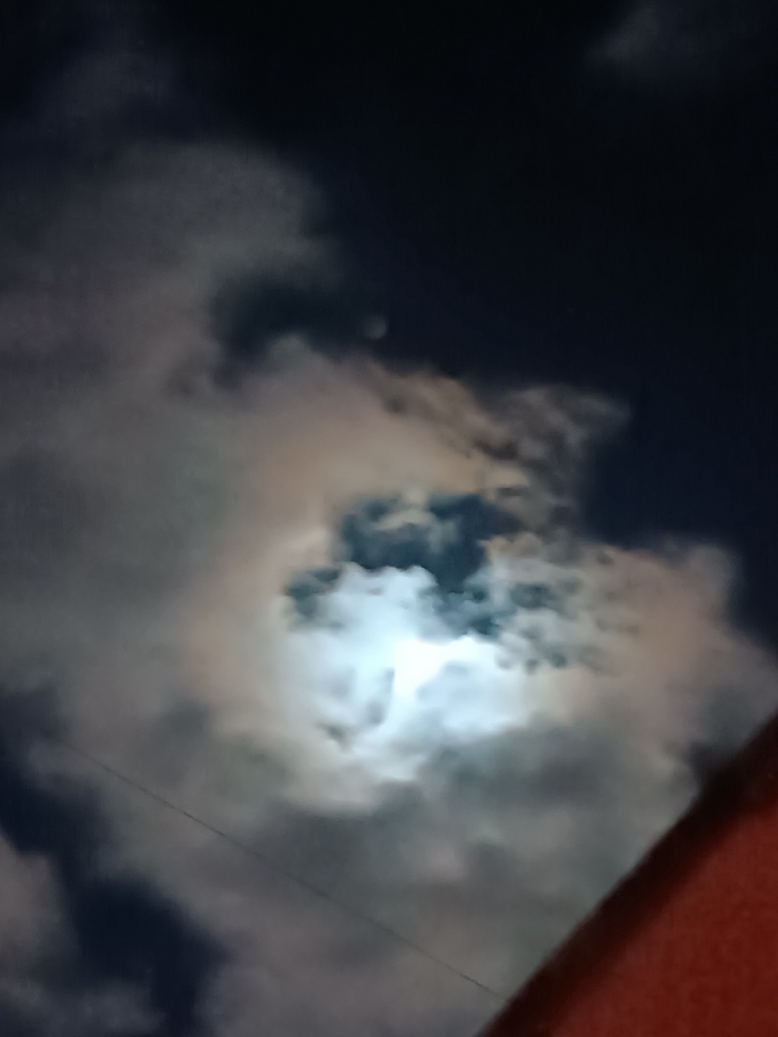 A nighttime sky filled with thick, billowing clouds. The moon is partially obscured, creating a bright, hazy glow within the clouds. Dark blue patches peek through the cloud cover, hinting at the night sky. A power line stretches across the lower left portion of the image. A reddish-brown object, possibly part of a building, is visible in the bottom right corner.