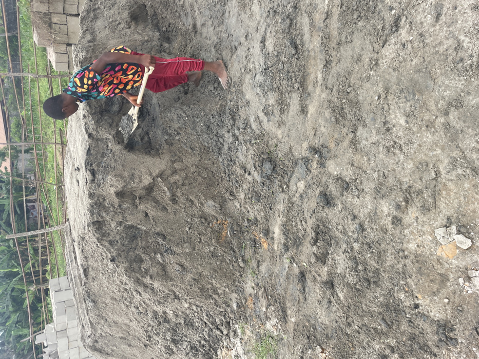 - "An outdoor scene in Ajara, Nigeria depicts a young individual, barefoot, wearing a multi-colored short-sleeved shirt and red pants, actively shoveling material from a large, irregular mound of gray sand or aggregate" by FM-dMQ3Y2, licensed under CC BY 4.0