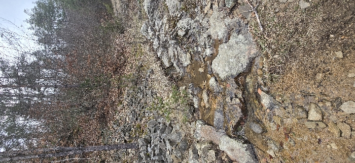 The scene depicts a natural, rugged landscape located in the city of Srednogortsi, Bulgaria. The foreground consists of uneven, moist brown soil, varied grey and brown rocks, and scattered dry leaves and sparse dried grass. A small, shallow stream of muddy water flows over and between these rocks. In the midground, a young green conifer sapling, approximately 30-40 cm in height, grows among larger grey rocks and a localized pool of muddy water. The background reveals a dense, upward-sloping forest comprised of bare deciduous trees with dark branches, the ground beneath them covered extensively with reddish-brown fallen leaves, intermingled with taller evergreen trees. The sky is partially visible at the top, appearing light grey and overcast. No human subjects or anthropogenic objects are present in the image.