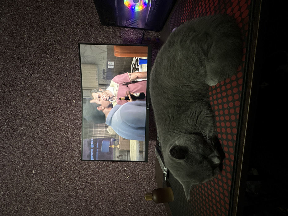 A gray, short-haired cat is asleep, curled on a red and black polka-dotted mouse pad situated on a desk in a room in Fergana, Uzbekistan. The cat's head rests on its front paws, facing left. Behind the sleeping cat, a curved computer monitor, branded "INNEX," displays a scene from a video game featuring two male characters engaged in a conversation within an indoor setting resembling a kitchen. One character, wearing a pink polo shirt, holds a bottle, while the other, wearing a blue shirt, stands with his back partially to the viewer, facing the first character. To the right of the monitor, a black computer tower with internal RGB fan lighting is visible, displaying "GEFORCE RTX" text. To the left of the monitor, a small, dark brown glass bottle with a golden stopper sits on the desk. The wall behind the desk has a textured, dark reddish-brown surface. The room is dimly lit. The specific location within Fergana cannot be visually confirmed from the image content.