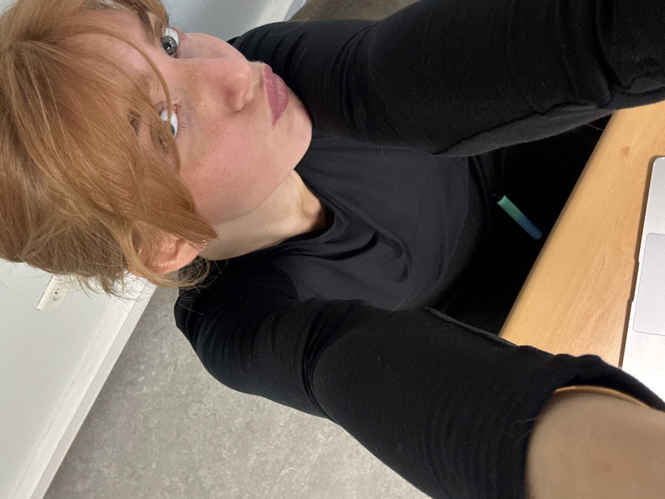 - "An individual with reddish-blonde hair and blue eyes is depicted in a high-angle, close-up photograph, looking directly at the camera with pursed lips" by FM-kV1q22, licensed under CC BY 4.0