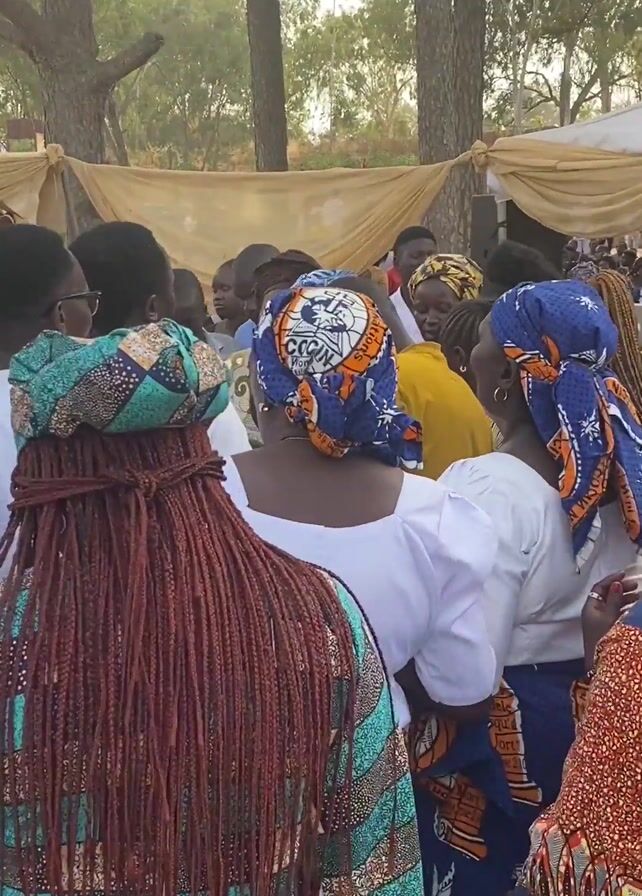 The video depicts a group of people gathered outdoors, seemingly at an event. The people are diverse, with varying skin tones and hairstyles, some with braids, and dressed in colorful traditional African clothing. Many women are wearing headwraps. There are some men wearing white gowns. They appear to be enjoying themselves, standing close together and engaging with each other. In the background, there are trees and tents. The atmosphere suggests a festive or celebratory occasion.
