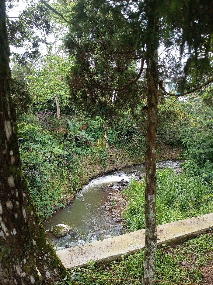 A stream flows through a lush, green landscape. Trees frame the view, with textured bark visible on the left and right. A concrete edge borders the stream's bank. The water flows around rocks, creating small white rapids. Dense vegetation covers the surrounding hillsides, including ferns and banana trees. A building is partially visible in the distance. The scene conveys a sense of natural beauty and tranquility.