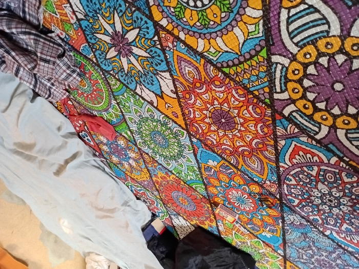A close-up shows a colorful patterned surface, possibly a rug or mat, featuring intricate mandala-like designs in a variety of vibrant hues including blue, orange, purple, green, and yellow