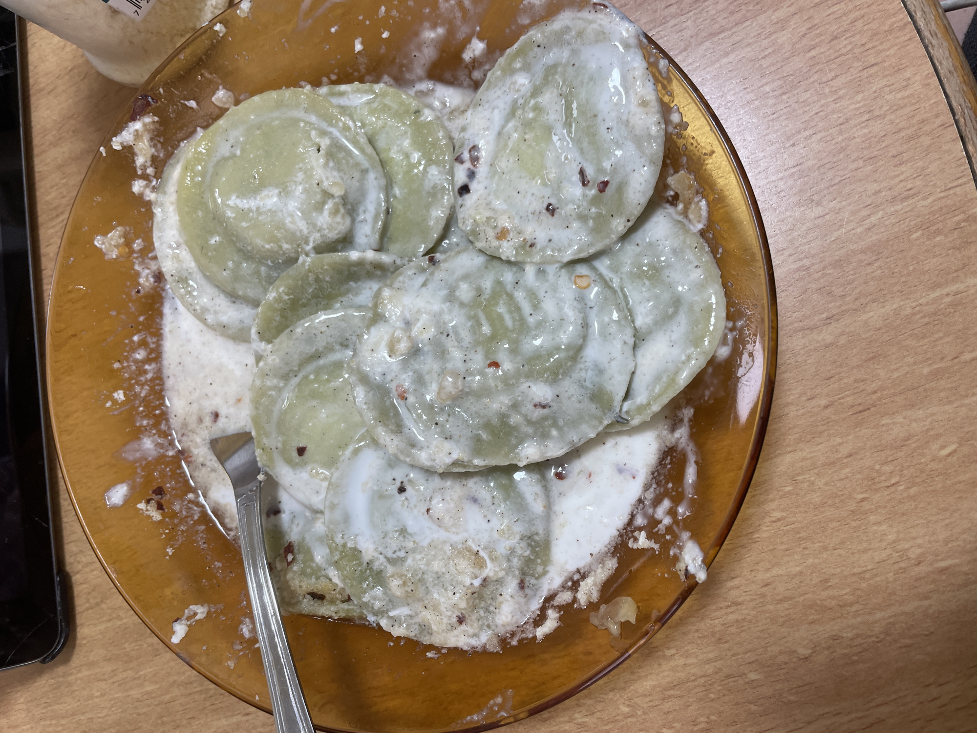 The image, captured in Petah Tikva, Israel, depicts an indoor dining scene. A translucent amber-colored plate, holding a serving of approximately ten to twelve round, light green ravioli, occupies the majority of the frame. The ravioli are thoroughly coated in a thick, creamy white sauce, generously garnished with visible red chili flakes and fine dark specks, indicative of ground pepper or herbs. Some sauce and seasoning residue are present on the plate's rim. A silver-colored fork with a plain handle rests on the upper left side of the plate, partially submerged in the food, suggesting an ongoing or recently paused meal. The plate is positioned on a light brown, wood-grain laminate tabletop. In the upper left background, a portion of a dark electronic device, likely a smartphone with a visibly cracked screen, is partially visible. To the upper right, a translucent shaker bottle, containing a fine white substance and featuring a barcode on a white label, is also partially in view. No individuals are present in the scene.