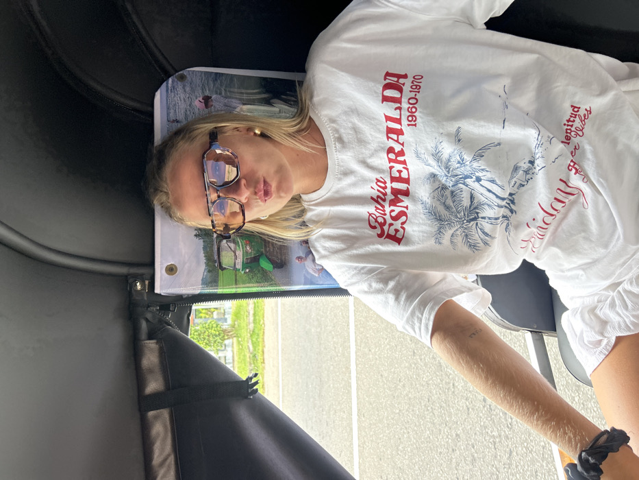 A woman is reclining in a dark space, using a picture as a makeshift pillow. She is wearing a white shirt with "Bahia Esmeralda 1960-1970" printed in red and blue. She has on large glasses and her lips are pursed. A glimpse of the outdoors reveals greenery and pavement. The black fabric surrounding her suggests she may be in a vehicle or enclosed structure.