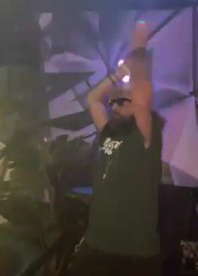person dancing with their arms raised in the air, holding what appear to be light-up toys or objects in each hand. The person is standing on what looks like a platform, with some equipment or furniture visible behind them. They are wearing a dark t-shirt, black pants, a light-colored hat, and sunglasses. The background includes a wall with a geometric design, along with some plants or foliage. Lighting effects create colorful patterns of red, green, and blue.