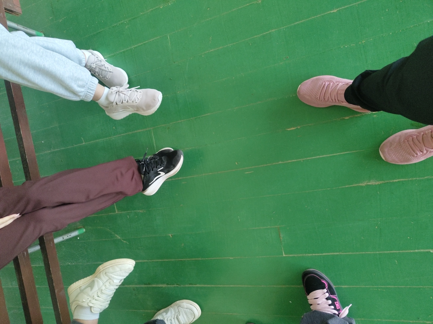 The image presents an overhead view of the lower extremities and footwear of at least five individuals standing or seated on a green-painted wooden floor