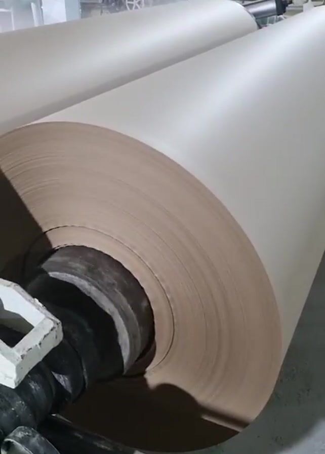 The camera shows a very large roll of kraft paper inside an industrial facility. There is a second large roll of the same paper behind the first. The paper is a light beige color and there are red pipes running across the ceiling. Some steam or fog is visible in the air.