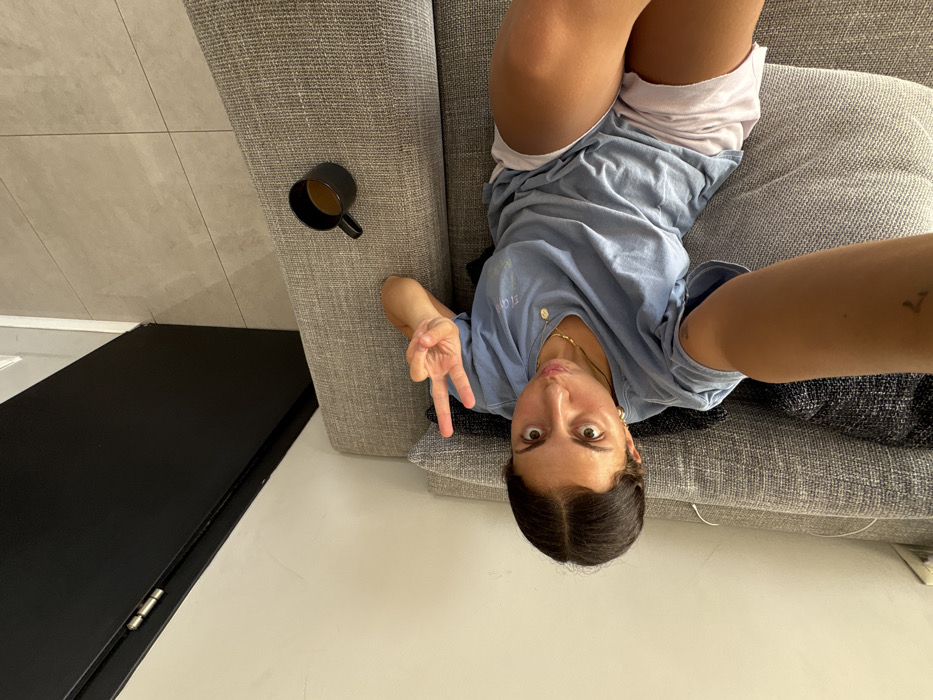 The scene is an interior residential space located in Rishon LeZion, Israel. A female individual with dark hair pulled back is reclining on a textured, light gray sofa, looking directly into the camera. She is wearing a light blue t-shirt and light-colored shorts, with a thin gold-toned necklace visible. Her left arm is extended, holding the camera, revealing a small tattoo on her inner forearm. Her right hand is raised, forming a peace sign. To her right, a black mug containing a dark liquid rests on the sofa. The background includes a white wall to the left, a black door or door frame section, and light gray tiled flooring.