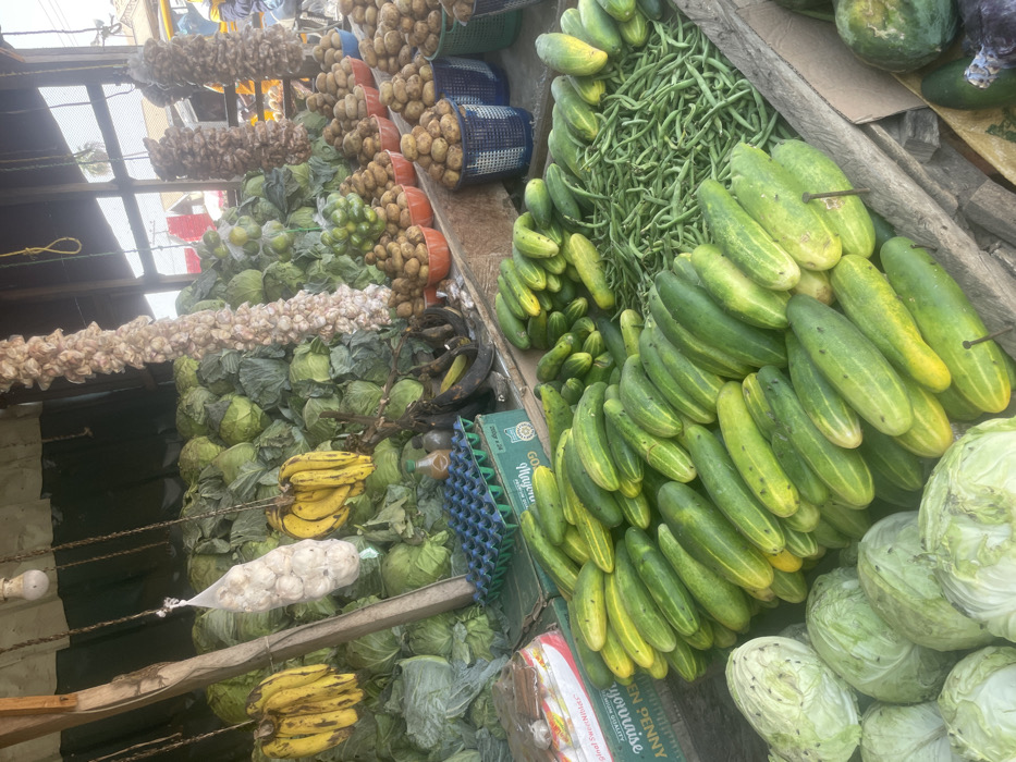 The scene depicts an open-air market stall in Numan, Nigeria, filled with various fresh produce