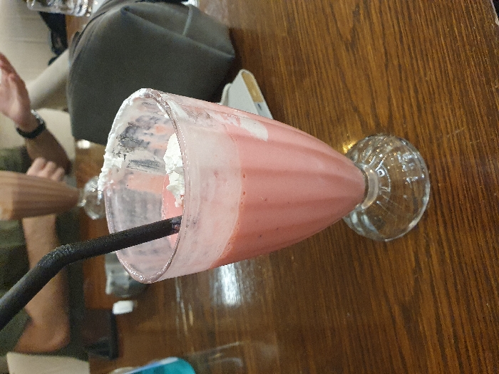 The scene depicts an interior setting, likely a cafe or restaurant located within the Kafr Sousa Municipality, Syria. In the foreground, a tall, clear fluted glass contains a light pink, frothy beverage with a black drinking straw inserted. White residue, consistent with foam or whipped cream, adheres to the upper inner rim of the glass and floats on the drink's surface. This glass rests on a brown wooden table with a visible grain. In the mid-ground, a second, similarly shaped glass containing a brown beverage is visible behind the primary drink. Portions of at least two individuals are discernible. To the left, an arm wearing a green short-sleeved garment is partially visible. To the right, another arm, featuring a black wrist-watch, is raised with an open palm, indicative of a gesture or interaction. Additional objects on the table include a blurred blue item and a small white object to the left, a dark grey fabric pouch positioned to the right of the central glass, and a partially obscured white rectangular object beneath the pouch. A clear glass containing liquid is partially visible on the far right of the frame.