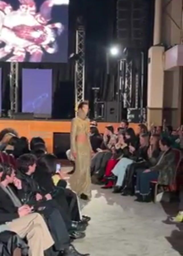 A fashion show is taking place inside what appears to be an older theater. A female model walks confidently down a runway lined with seated audience members. The model wears a long gold-colored dress with cutouts at the waist and a high neck. The audience is a mix of ages and genders, many of whom are holding up phones to record. The theater's interior includes a stage area, dark curtains, and several lighting rigs. A large screen behind the stage displays a close-up image of a spider. The ambiance is stylish and contemporary, with a focus on the presentation of fashion.