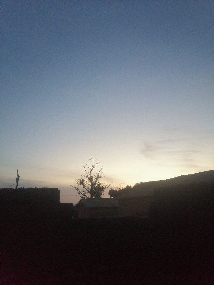 Against a gradient sky shifting from blue to muted orange near the horizon, a silhouette landscape is revealed. A bare tree stands among low buildings, likely a village scene. Dark shapes in the foreground, perhaps walls or foliage, obscure part of the view. The horizon is uneven, suggesting a hilly terrain. The overall impression is tranquil, a rural landscape at dusk or dawn.