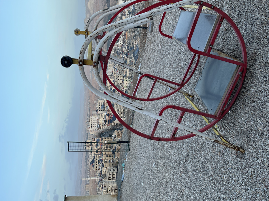 An old, rusty merry-go-round with two seats sits on a gravel surface. The structure is red and white, showing signs of wear. In the background is a cityscape with buildings clustered together, extending into the distance towards a horizon of hills under a pale sky. A rectangular metal grid is partially visible in the lower left, adding another element to the scene's composition.