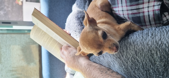- "A small tan chihuahua rests comfortably on a person's lap while they hold open a book" by FM-rGZrc2, licensed under CC BY 4.0