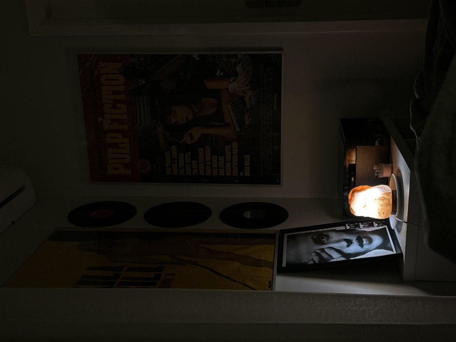 A room with posters and records. A "Pulp Fiction" poster hangs above three vinyl records. Below the records is a poster with text and a black and white portrait in a frame. A salt lamp sits on a white surface, glowing warmly and casting light on the scene. The room appears dimly lit, creating a cozy atmosphere.